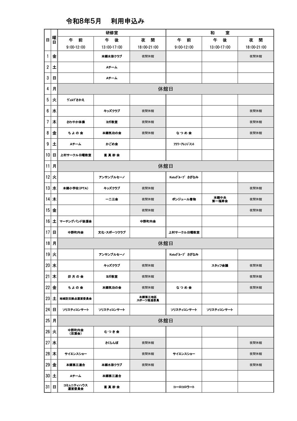 団体利用予約状況|本郷小学校コミュニティハウス - 特定非営利活動法人さかえ区民活動支援協会