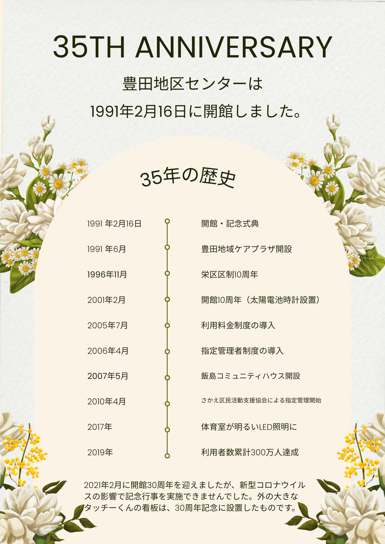 おかげさまで、豊田地区センターは2月16日で開館35周年を迎えます。