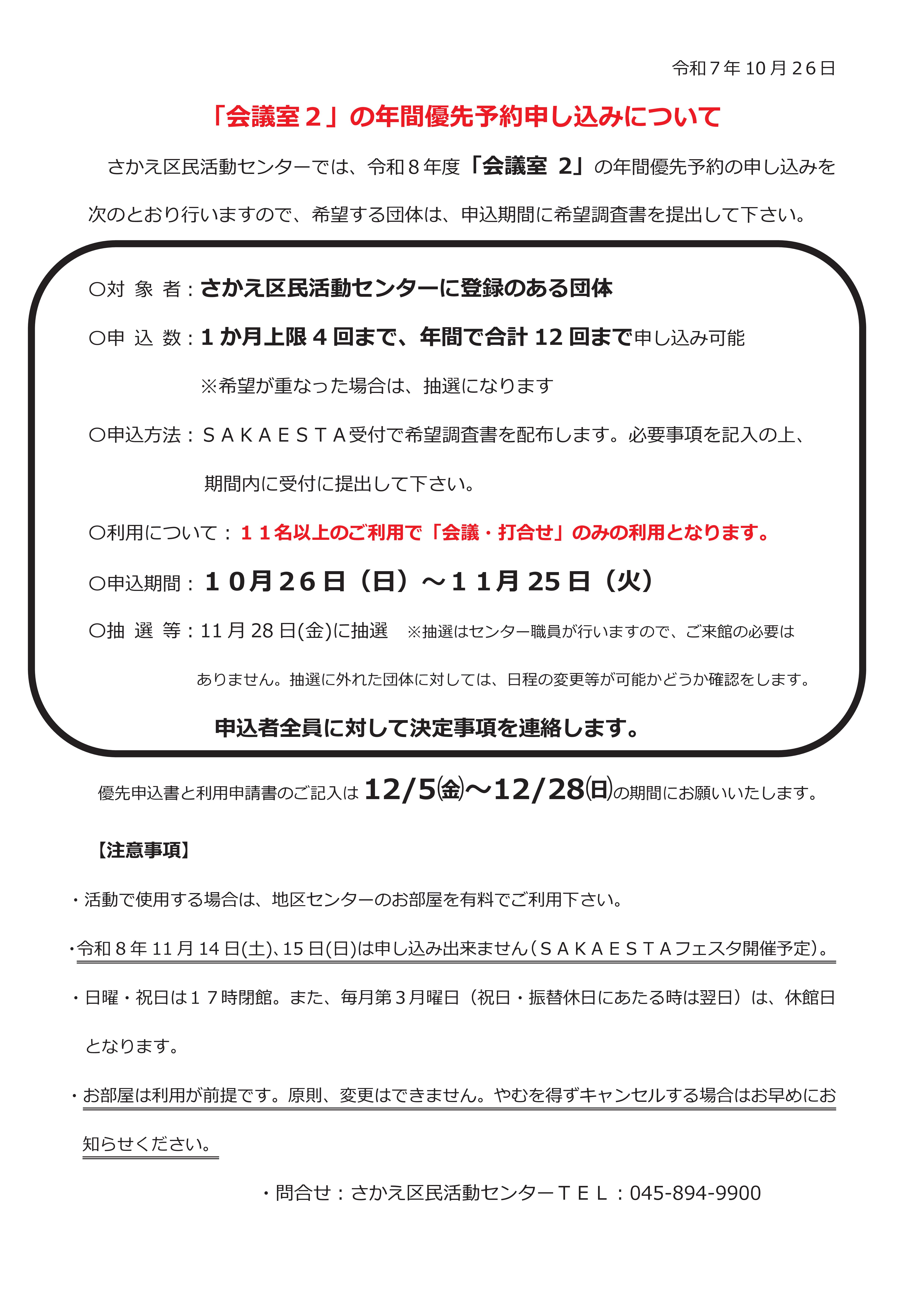 令和8年度の会議室2の年間優先の受付を10/26(日)〜11/25(火)の期間で受付けています。